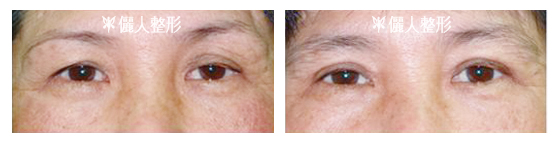 上圖例有明顯眉毛下垂及眼尾下垂,右圖是做完上眉切及將部份眼尾皮膚同時切除後的術後照片。下垂得到改善,手術後的疤痕不明顯。
