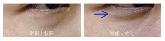 ♦採眼袋脂肪移位手術可以同時改善眼袋及淚溝,術後並可以讓臥蠶(下圖箭頭處)變得更明顯,人看起來更年輕。