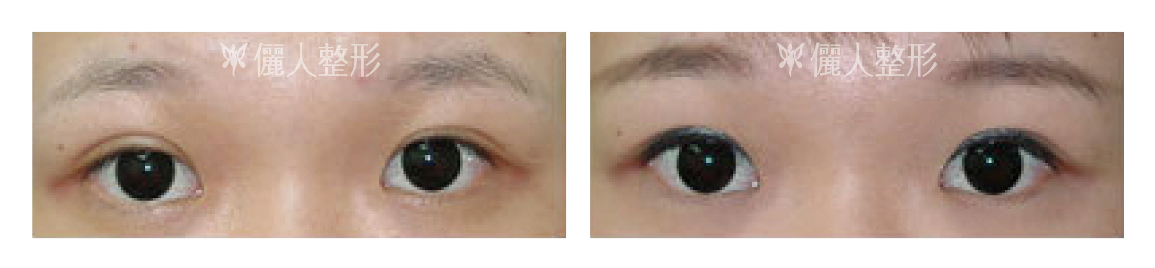 上左圖:是術前,右圖是縫雙眼皮後,兩眼變成平行雙眼皮,也就是全開放式眼頭了。