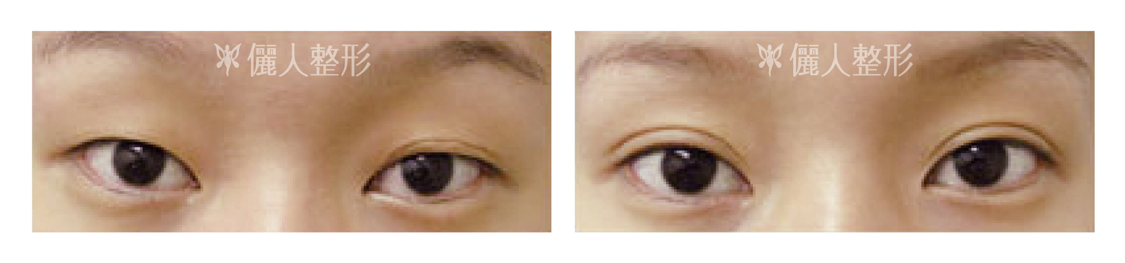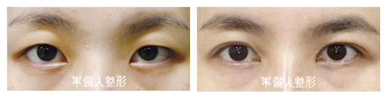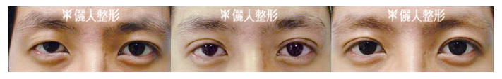 下圖例:在術前(右圖)有因左眼瞼較無力,眼睛看起來較小。