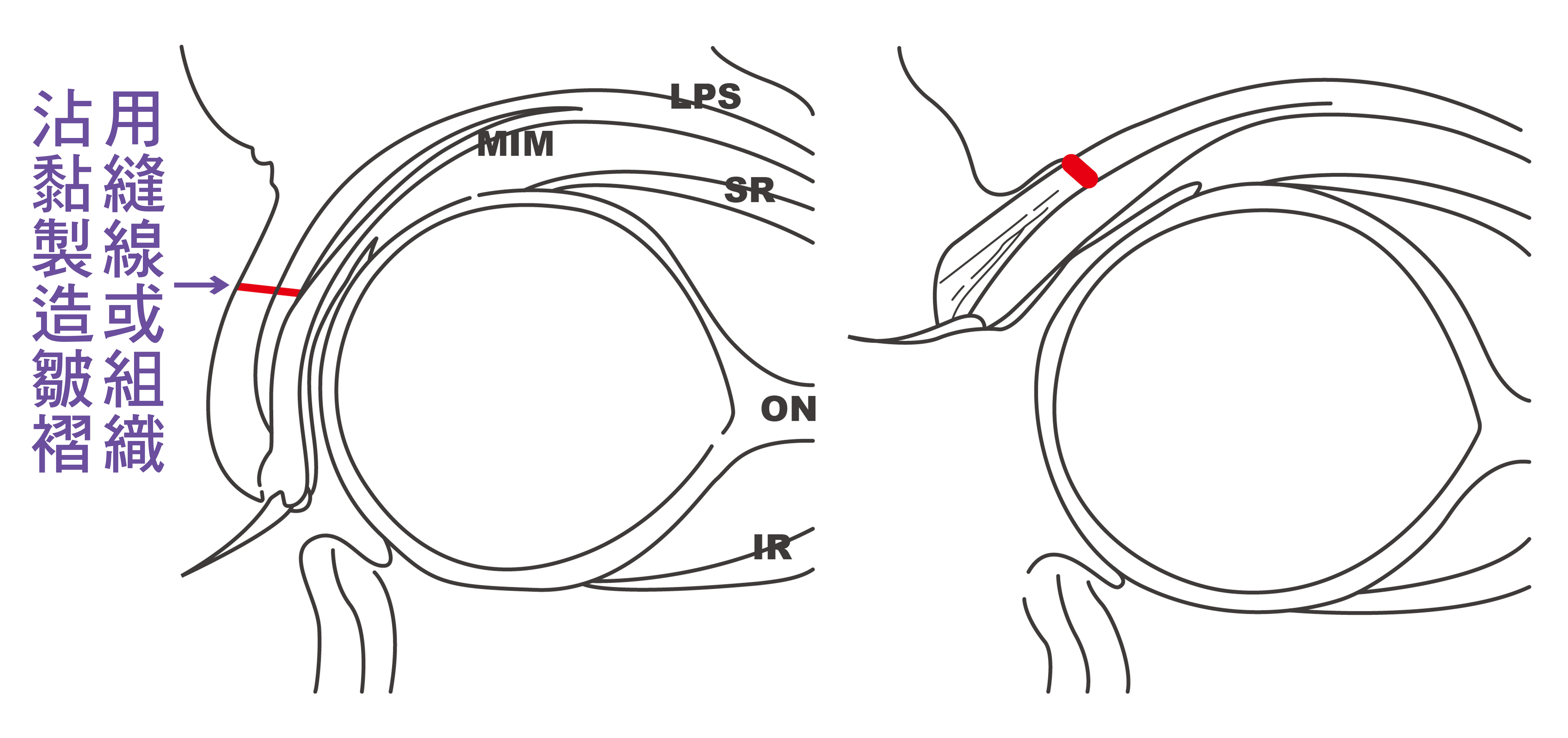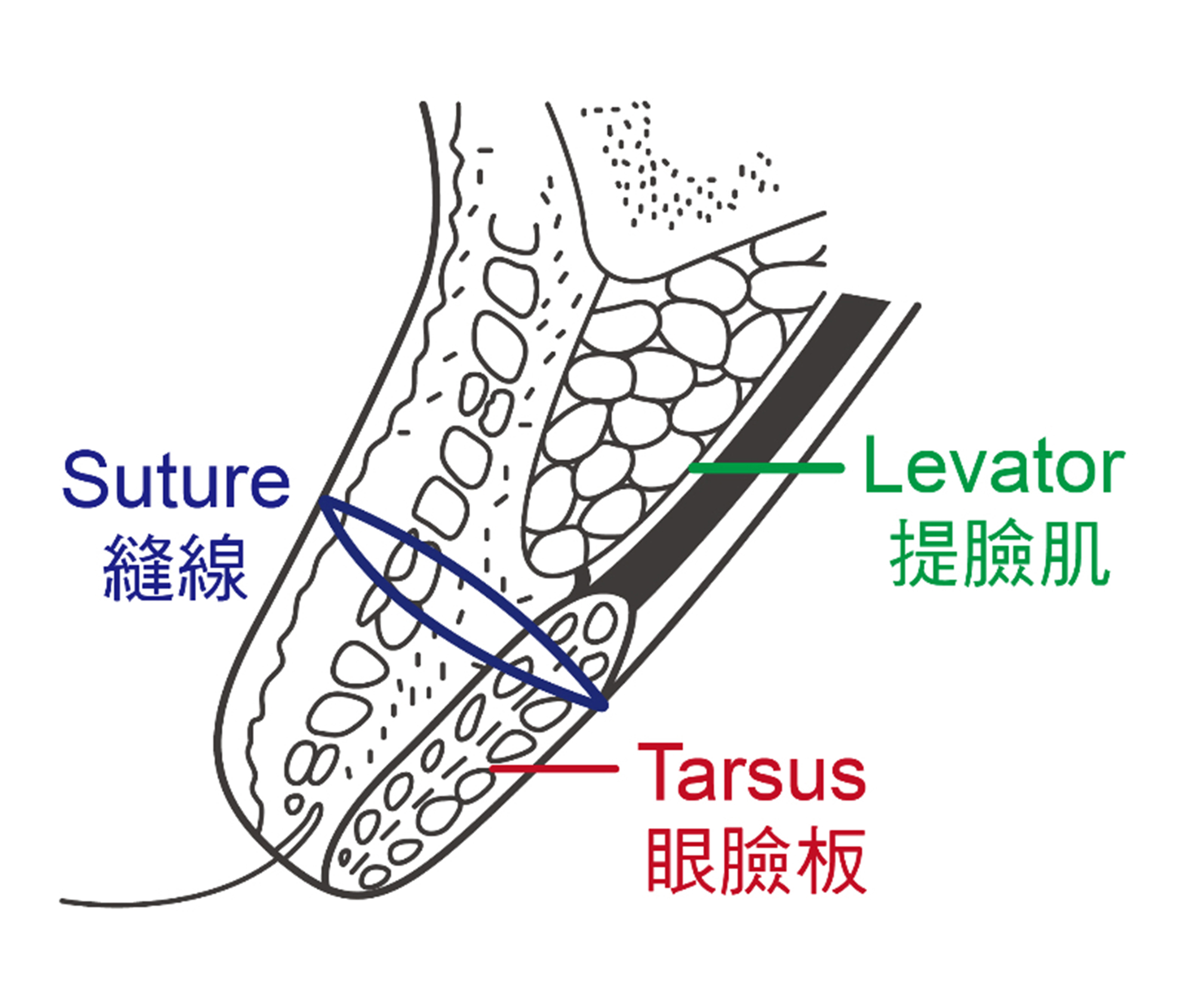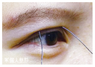 用縫線將眼皮與深層之提瞼肌或眼瞼板綁在一起(縫雙眼皮法),
