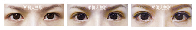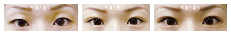 上圖例左至右是術前、縫雙眼皮後及開眼頭後。術前兩眼距較遠,做完這兩種手術後眼睛變明亮,眼距變近,眼頭內側肉阜可以露出來。