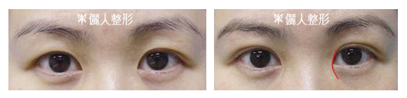 但因她有很明顯的蒙古褶,內側雙眼皮會被往下拉(如紅線所示),術後仍是封閉式眼頭。