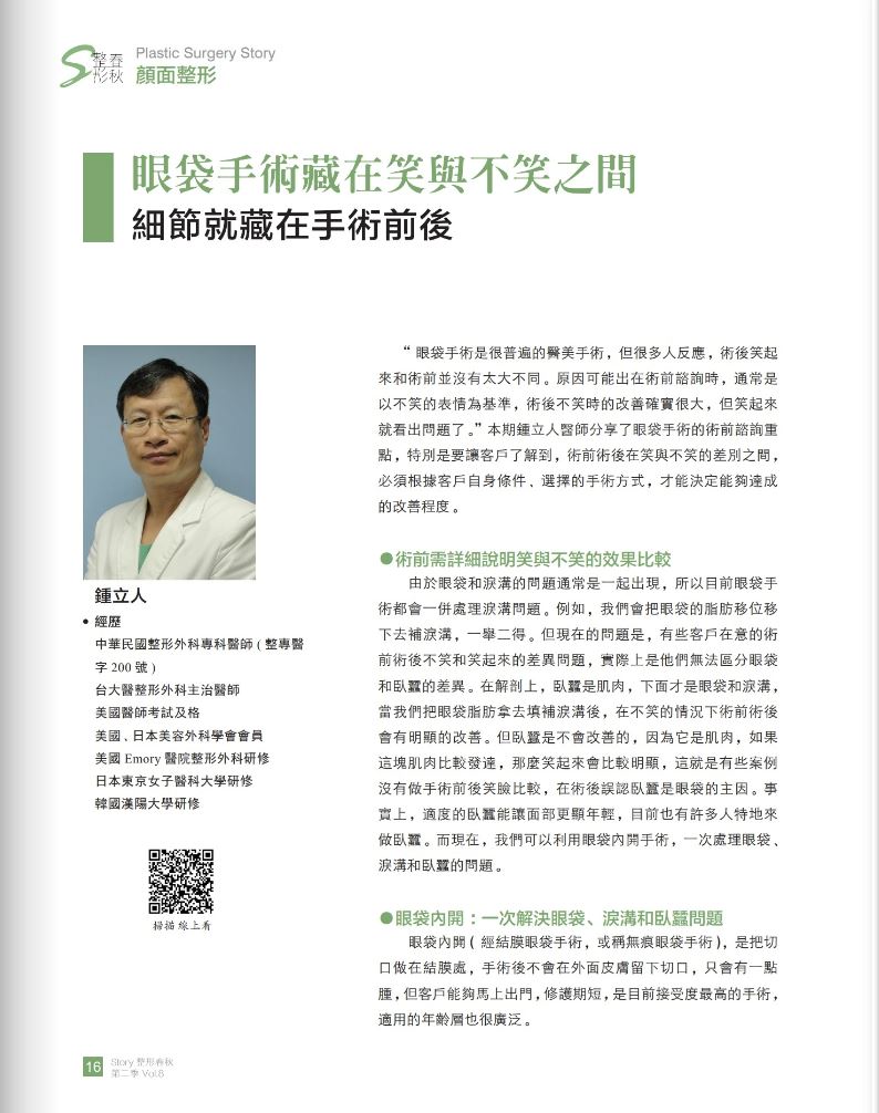 以下是鍾立人醫師發表在整形外科醫學會衛教刊物: 整形春秋的文章。某些人術前看似大臥蠶的下方是因眼袋造成;這種人眼袋手術後笑起來臥蠶會變小。但少數人先天臥蠶肌肉就很大,這種人眼袋手術術後笑起來不會有改善。