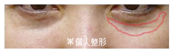 下列圖是年輕的病例,在眼袋的下方有明顯的淚溝,使用內開式脂肪移位的手術方式,眼袋可以得到明顯改善。