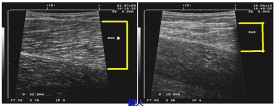 其他蘿蔔腿的報導追踨時間常常是幾個月而已,我們會長期追踨我們的案例,以下是做完肌肉雕塑手術術前(左)與術後二年九個月(右)的內腓超音波圖。術前是2.2cm,術後是1cm,即使是男性病人,肌肉並沒有長回來或手術造成小腿功能影響。