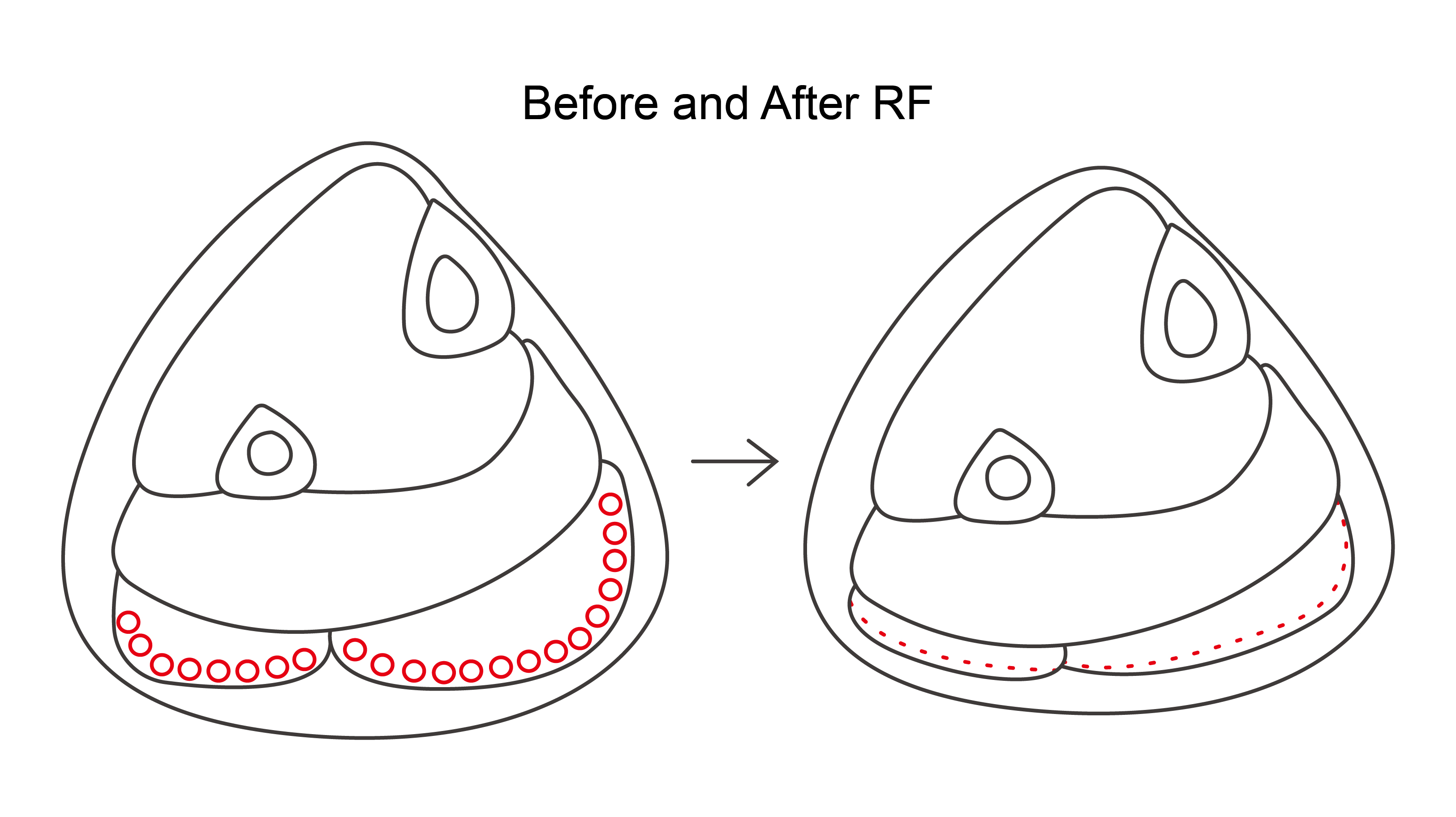 市面上有一種RF燒灼器,可以在小傷口下將燒灼棒伸入肌肉,燒灼肌肉,讓肌肉壞死,爾後壞死部位形成疤痕,肌肉就會變小,如下左示意圖。