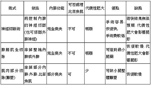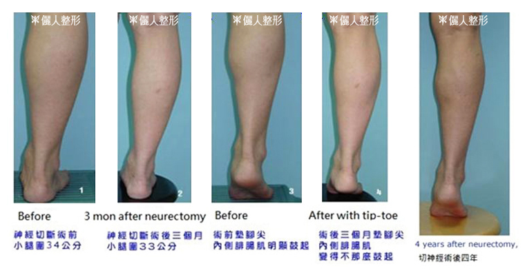 - 相對於切神經或肌肉全切除手術,部份切除術後比較沒有代償性肥大的問題,但如果病人在術後仍經常從事小腿的運動的話,比目魚肌多多少少會代償以致於影響腿形。