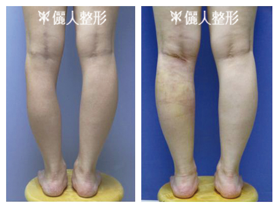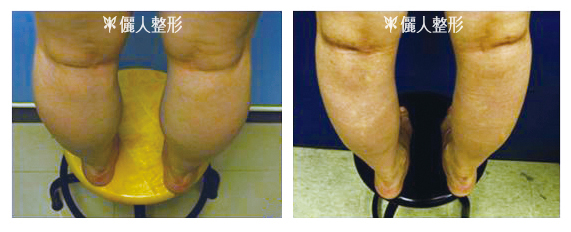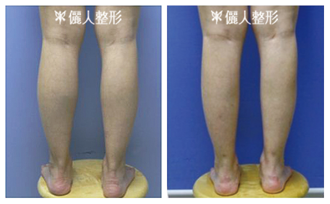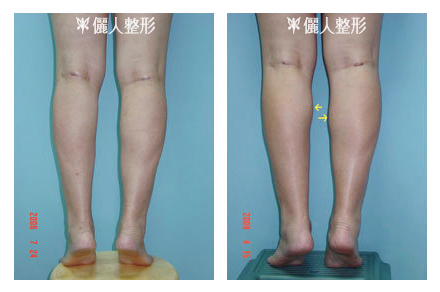 下一案例在他院實施腓腸肌切除手術,造成小腿嚴重凹陷(下左圖),經本院自體脂肪移植後,小腿外形得到改善(下右圖)。