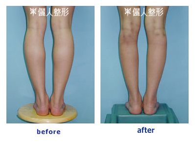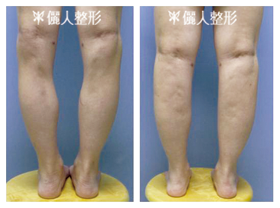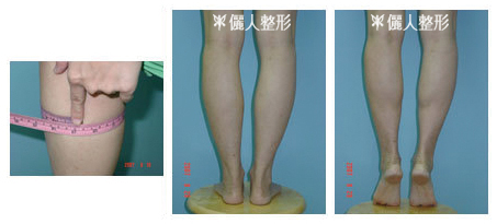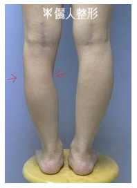 她在本院實施小腿肌肉部份切除手術。將兩腿突出來的部位下方的肌肉部份切除掉,得到如右圖的結果。小腿漂亮對稱多了。