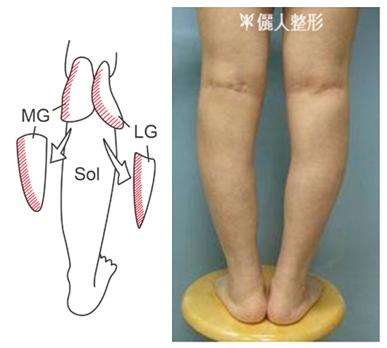 A : 內側腓腸肌影響的是小腿內側的曲線,比目魚肌影響的是外側曲線,外側腓腸肌與小腿外後方的鼓起有關。病人幾乎都會做內側腓腸肌。要不要做其他兩塊肌肉要看病人的腿形。