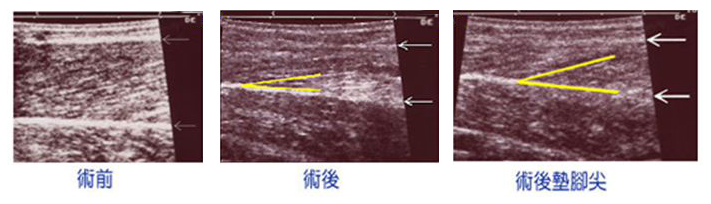 術前的內腓厚度是19 mm(超音波左圖,白色箭頭內為內腓)。術後二個半月的內腓厚度是11 mm(超音波中圖)。肌肉在超音波下可以看到紋理,當肌肉在收縮時肌肉紋理的角度會變大。病人在術後腳板平放時內腓肌肉紋理是12度(超音波對中圖,黃色間的角度),術後墊腳尖時變為20度(超音波右圖),可見術後的肌肉是有功能的。但如果肌肉部份切除的量較多的話,肌肉功能也可能會受影響。