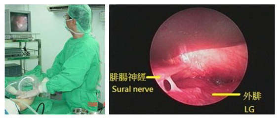 - 腳板外側皮膚感覺的暫時麻痺:有一條很長的感覺神經(腓腸神經),它位於外腓肌的外表及內腓及外腓間,從膝蓋部位一路走到腳板外側,負責腳板外側皮膚感覺,在手術時只要踫到它就會有感覺的暫時麻痺現象,目前手術全程在內視鏡導引下進行,可減少神經受傷。