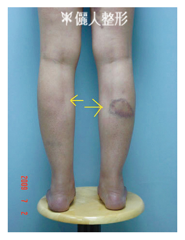 上圖例在九年前在他院實施切神經手術,從照片可以看出兩腿有明顯差異,左小腿箭頭有明顯凹顯。