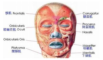 現在醫學界對於皺紋的成因及治療早已有長足的進步。皮膚老化時,皮膚的表皮層及真皮層會變薄,皮膚的含水量會降低,因此皮膚會慢慢失去彈性,首先出現的是皮膚細紋,這是第一期。慢慢地皮膚變薄之後加上表情肌肉的過度收縮,造成魚尾紋不笑的時候不會有,笑的時候很明顯。又例如皺眉頭時,眉間紋很明顯;抬頭時,抬頭紋很明顯,醫學上稱之為「動態皺紋」。也就是說,有表情時才會有的皺紋,此為第二期。下圖是表情肌的解剖圖。