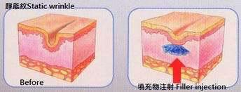 到了第三期,靜態皺紋已經固定成型,就必須將皺紋處變薄的真皮層施打填充物以填平皺紋。填充物有膠原蛋白、玻尿酸等等。膠原蛋白是皮膚的成份之一;玻尿酸則是一種存在於皮膚的多醣體。「膠原蛋白」的材料取自於牛的身上,它的結構式與人體不同,在施打前必須先做皮膚測試,以避免過敏反應的發生。玻尿酸的材料取自於生化科技,它的結構式幾乎與人體相同,施打前則不需做皮膚測試。填充治療的效果是暫時的,這些填充物質最終還是會被身體分解掉。下圖是注射填充物治療靜態紋之示意圖。