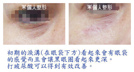 使用玻尿酸做淚溝填充時不要打太多,不然可能反而會有淚溝隆起的現象,特別在笑的時候更明顯(見下圖例,在它院施打玻尿酸)。除了等玻尿酸慢慢消失外,也可以施打玻尿酸的降解酶加速玻尿酸消失。
