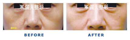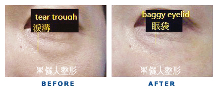 下圖病例有眼袋及淚溝的問題,做眼袋手術可以同時改善眼袋及眼溝兩個問題,但病人暫時不希望手術。用玻尿酸注射在淚溝處,可以改善淚溝及眼袋,但注射後仍可以看到眼袋(做眼袋手術可以消除眼袋,但玻尿酸無法消除眼袋)。