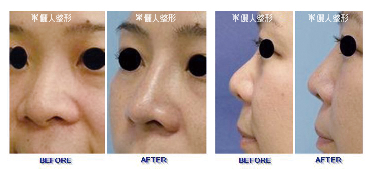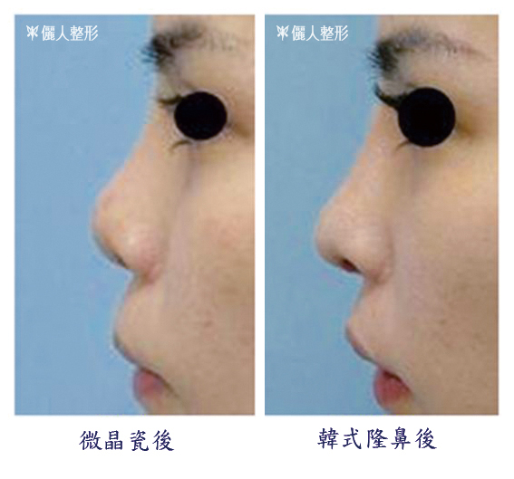 使用微整形隆鼻是無法有效將鼻頭做挺的。下圖例左圖是使用微晶瓷隆鼻的照片,右圖是做韓式隆鼻的術後照,鼻頭明顯變高。其他案例請參考網站「韓式隆鼻」之介紹。