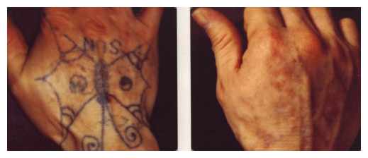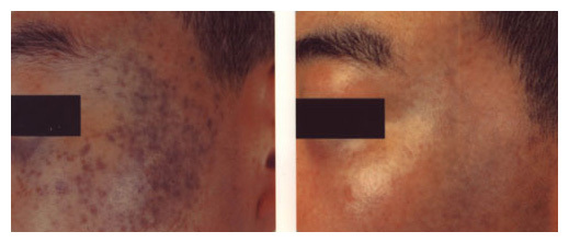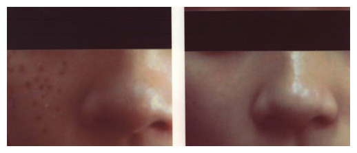 銣雅各雷射(Nd-YAG Laser)使用在治療皮膚上黑色素問題,如黑斑,刺青等,的歷史已有數十年以上,一台機器可以使用532柰米及1064柰米二種波長,可以依病人的病情不同做選擇,以得到最好的療效,但基本上傳統銣雅各雷射是一種局部治療,只治療黑斑的位置,治療後會留下結痂(如下中間圖),一至二週後結痂掉了,黑斑會得到明顯改善。如下圖。