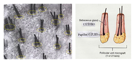 首先必須了解毛髮的基本結構,毛髮本身就如同皮膚上的角質層一樣是死的組織,它是由包在毛髮外面的毛囊所生成。毛髮的生長點有二個,一個位於毛囊的底部,稱之為毛乳頭,另一個生長點位於毛囊的中間部位。植毛手術時醫師移植的是活的毛囊(不可以破壞毛囊的生長點),而不是死的毛髮。在結構上頭皮的毛髮會有一束束的現象,也就是說一束中的毛髮在皮膚上的出口是很近的,我們稱之為毛囊單位(如下左圖,圈起來的部份為頭皮的毛囊單位),一般是二根毛髮成為一束,也可能是三,四根毛髮成為一束,也有部份的毛囊單位只有單根的毛髮。在治療禿頭的植毛手術時,會使用毛囊單位做移植,也就是說將頭部後面的毛囊單位移植到禿髮區。睫毛的結構不同於頭髮,是一根一根各自獨立的。在做植睫毛手術時我們必須把頭皮的毛囊單位精細地拆解成一根一根後(如下右圖,必須將內含二根毛囊的毛囊單位拆解為二根單株毛囊),種在眼皮處,當然不可以傷害到毛囊。如果使用頭皮的毛囊單位種在眼皮處的話,睫毛的方向會很亂。