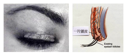 植睫毛手術的另一種做法是:拿下一小片帶有毛囊的薄薄頭皮,然後將這片頭皮塞進上眼皮切開的傷口內,如下圖示:左圖是將頭皮放在上眼皮處尚未放入上眼皮的照片,右圖是頭皮放入上眼皮的位置示意圖,這方法省去將頭皮毛囊拆解為單株毛囊的過程。