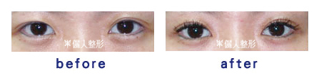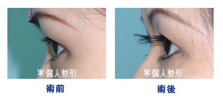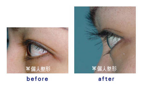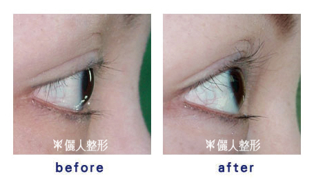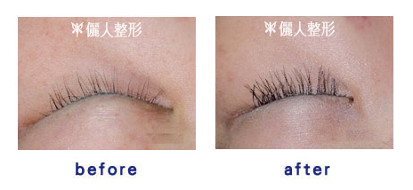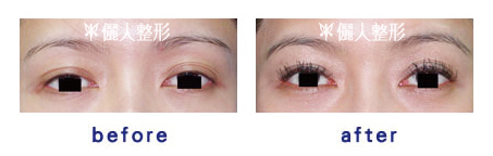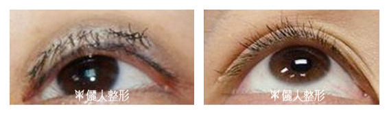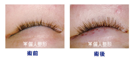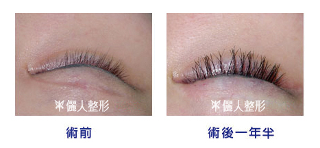 下圖的病例就是一位長期接假睫毛造成真睫毛變短少的病例,右圖是她做完植睫毛手術後的照片。