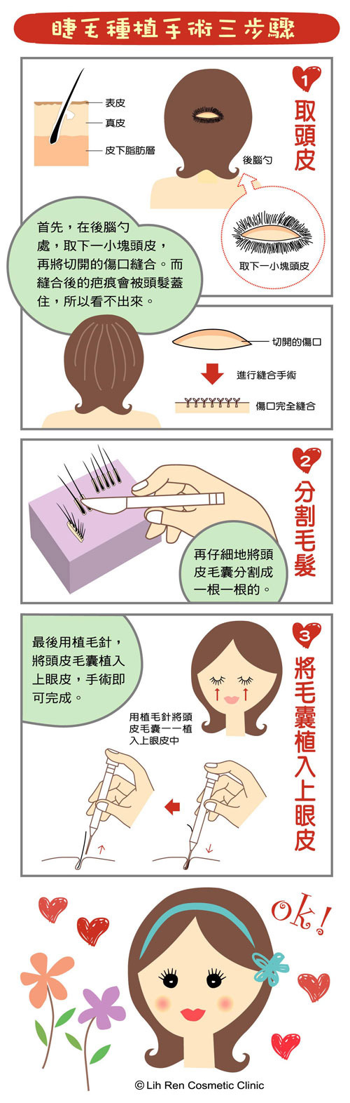 植睫毛手術可以分為三個步驟,第一是在後腦杓部位取下一小塊頭皮(寬度約二公分),傷口將它縫合,疤痕癒合後藏在頭髮裏不容易被發現。第二步驟是將取下來的頭皮,很精細的將毛囊分解為單株毛囊。第三是使用植毛針將毛囊種在上眼皮處就完成手術,我們會儘可能植入更多毛囊,讓睫毛濃密,一般一側是植入四,五十株單株毛囊。在植睫毛手術時我們會儘量將植上去的毛髮配合真睫毛的角度,避免角度向下,造成睫毛倒插。底下是植睫毛手術的圖示。