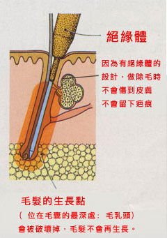 A : 除毛針因為在針的根部有絕緣的設計,所以在執行除毛時不會燒灼表皮,不會留下疤痕,有蟹足腫的人也可以做。術後護理很簡單,如有須要的話前二至三天做冰敷。如果在除毛後有紅點的話,少曬太陽,很快就會好。