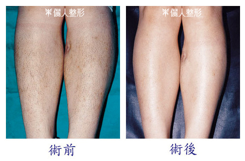 右圖:本診所使用除毛針除毛追蹤至今已十年(至97年六月),腿毛不再生長。